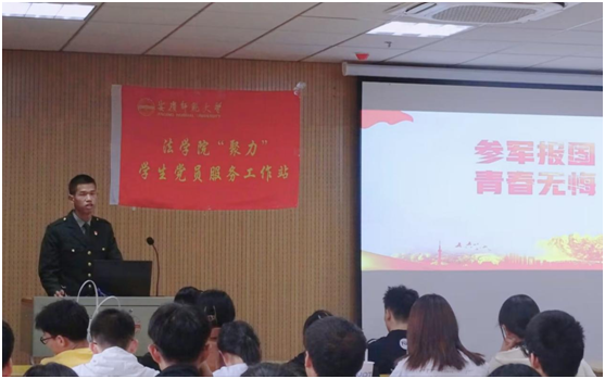 bevictor韦德国际2021级研究生赵佩文是来自北部战区的一名工程兵。他结合自身经历为大家介绍了我国的五大战区和七大军种,详细介绍了同学们最为关心的入伍政策和报考军校等问题,解答了同学们对于参军入伍的诸多疑问。