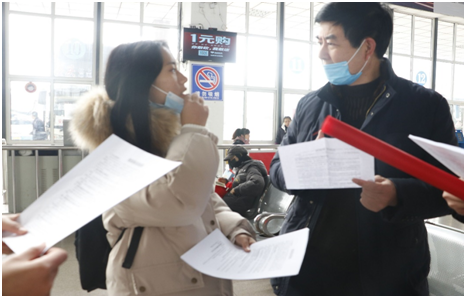 员工志愿者到达高铁站集合点后,分头分散到高铁站外的各个区域,向来往的乘客说明身份和来意,在值班民警的协助下进行宪法宣传活动。志愿者们将宣传与讲解相结合,为往来群众进行在法律知识答疑解惑。