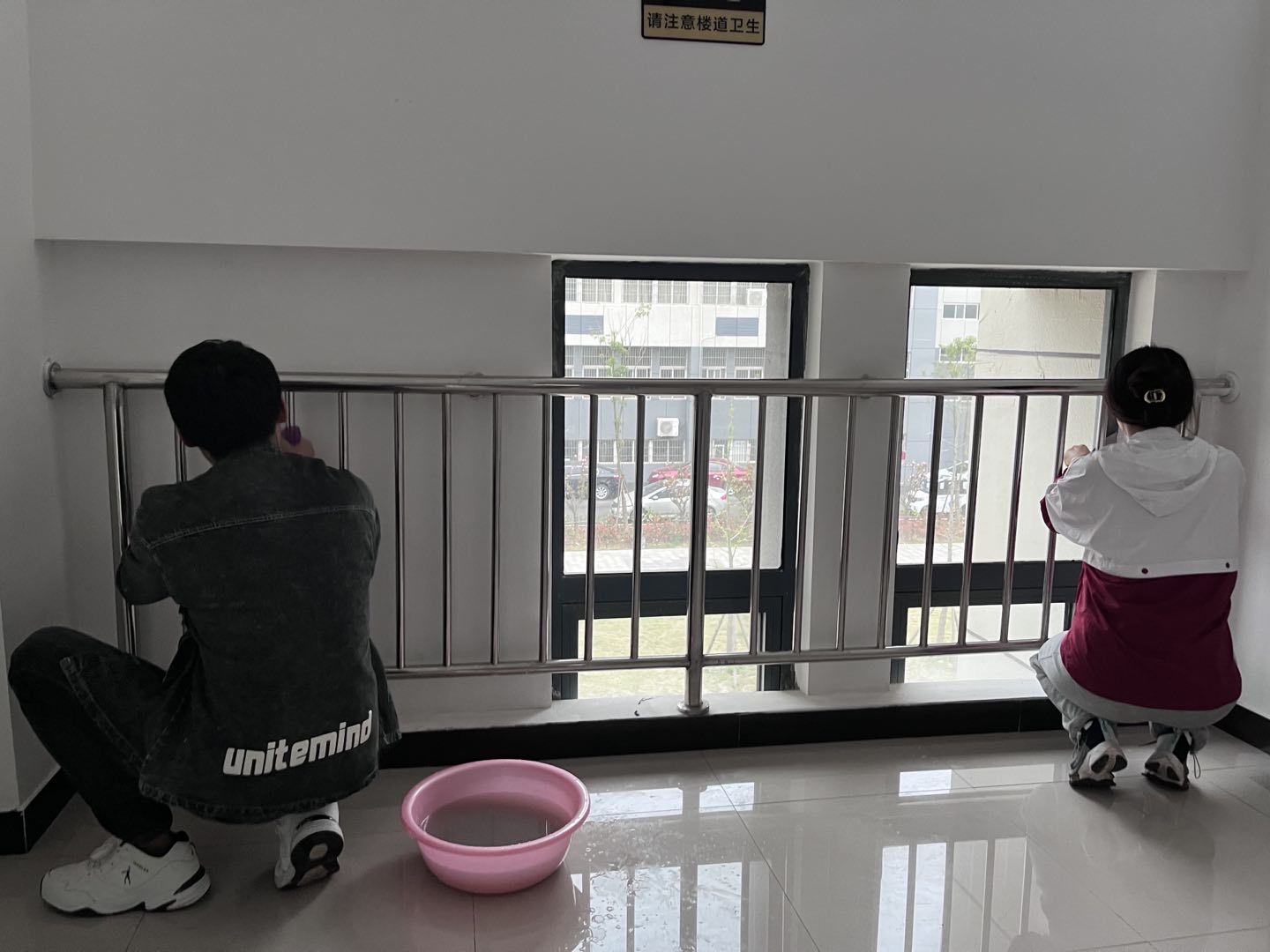 在师生们的相互配合下,清扫工作有条不紊地开展。一眼望去,从大厅入口到教室,从楼道口到模拟法庭,从教研室到办公走廊,师生忙碌的身影成为bevictor韦德国际0楼一道独特的“风景线”。有序的清扫如火如荼地进行,有的三人一组用抹布轻轻擦拭门窗与玻璃;有的同学用拖把打扫教室地面;有的同学认真清理楼梯间杂物,有的老师用铲子清理门窗的污迹。大家各有分工、齐心协力,利用拖把抹布铲子,狠抓细节,不留死角。