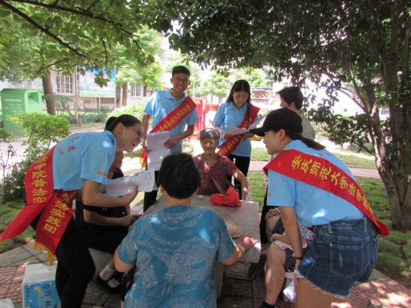 除了向员工、妇女讲解法律知识,实践团的成员们还走进了燎原敬老院,除了给老人们带去水果、陪老人们聊天,还通过身边和电视里一系列诈骗事件,为老人们普及生活中权益保护的法律法规。成员之一湛波说:“我希望能够通过自己的一份努力让他们了解一些法律知识,从而能够避免被骗。参加这次活动也让我受益匪浅。”