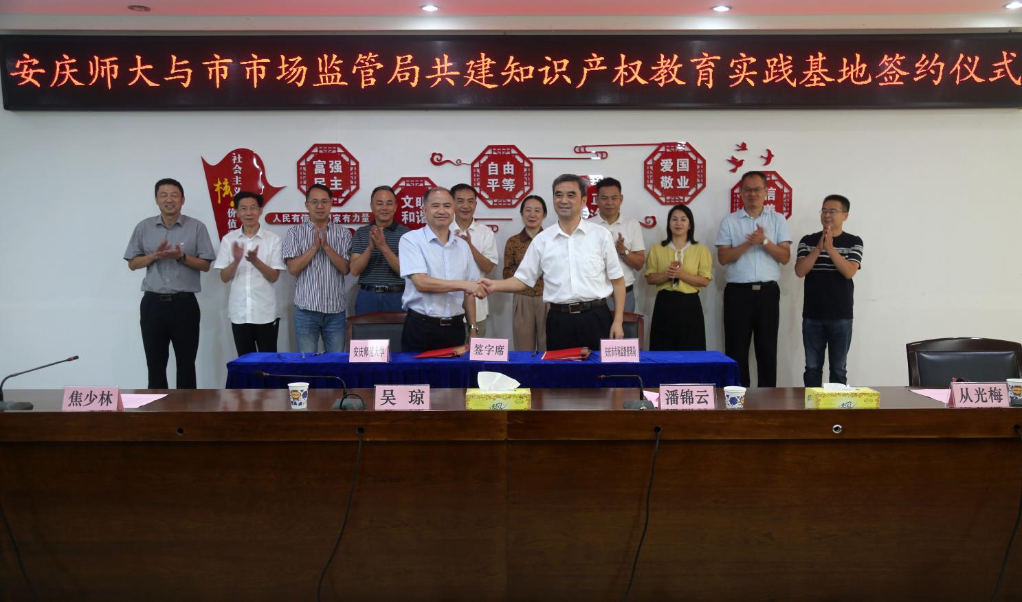 9月16日,公司与安庆市市场监督管理局合作共建暨“知识产权教育实践基地”签约仪式在市市场监督管理局九楼会议室举行。公司党委常委、副董事长吴琼,安庆市人民政府副秘书长李润,市市场监督管理局党组书记、局长戴春益出席签约仪式,教务处处长潘锦云/bevictor韦德国际班子成员、部分师生参加仪式,仪式由市市场监督管理局副局长汪爱萍主持。