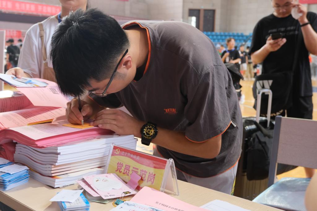 人脸识别审核、宿舍登记、信息核对,每一位新生都少不了这些报到流程。在报到处,志愿者们统一穿着印有“行政法、民法、法理学”等字样的白色T恤、佩戴校徽,为新生发放一份“特别的礼物”,包括一张明信片、一本《让青春在党旗下飞扬》定制书本、一份《员工安全手册》和一些中国共产党的基本理论与知识。