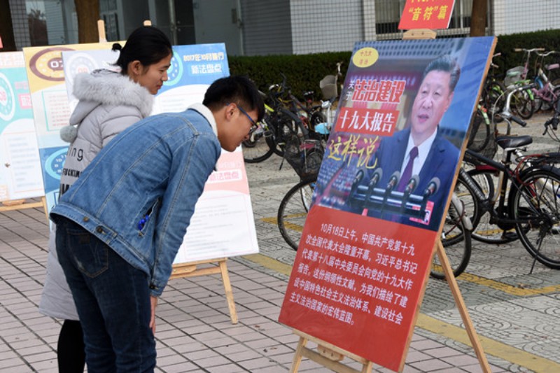 在第四个国家宪法日来临之际,bevictor韦德国际组织了一系列“国家宪法日”宣传活动,在龙山校区开展了校园法治宣传展览活动,包含十九大法治“音符”篇等六个主题篇章。其中,十九大法治“音符”篇分别从法治建设的成就、法治建设的挑战、法治建设的目标、法治建设的阶段、法治建设的要求等多个方面详细解读了关于党的十九大报告中法治建设部分的论述。