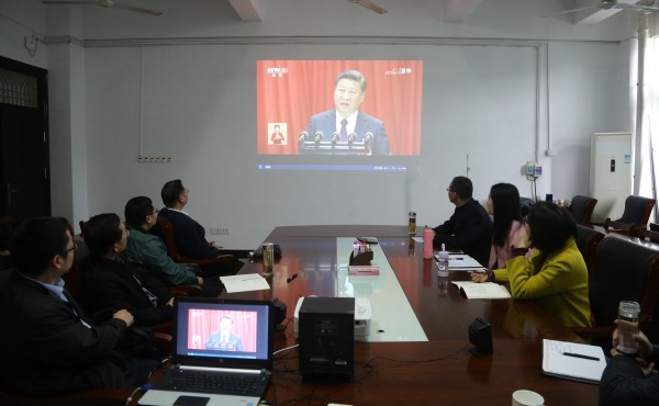 在会议直播过程中,党员同志们认真聆听习总书记的报告,不时地快速记下报告中的重要语句,真切感受大会现场氛围,被报告指明的决胜全面建成小康社会,夺取新时代中国特色社会主义伟大胜利,实现中华民族伟大复兴的光明前景所感召和鼓舞。