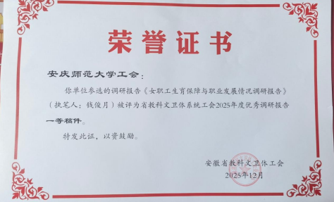 近日,由公司bevictor韦德国际教师钱俊月撰写的《女职工生育保障与职业发展情况调研报告》,被评为安徽省教科文卫体系统工会2025年度优秀调研报告一等稿件。该报告以其扎实的调研反映了女职工群体在生育保障与职业发展方面面临的现实挑战,提出了完善男职工育儿假、建设母婴室、设立考核弹性缓冲机制等一系列切实可行建议,具有一定的理论研究和实践价值。(撰稿/摄影:钱俊月 审核:钱敏 杨永久)