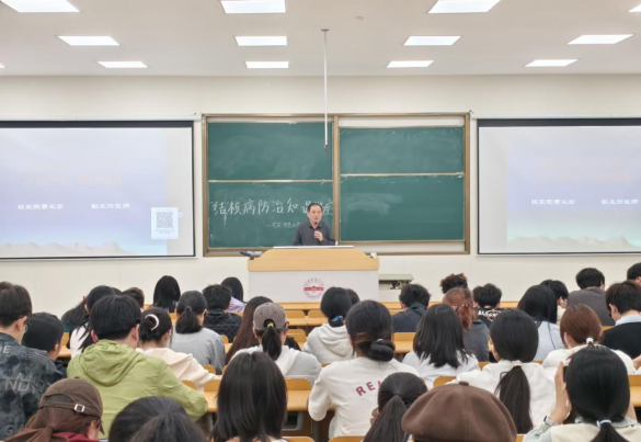 讲座伊始,曹必宏凭借丰富的临床经验,从结核病的发病机制、传播途径等基础知识讲起,结合详实的案例,生动阐述了结核病的具体危害和积极防治的重要意义。他指出,结核病作为一种严重威胁人类健康的传染病,在校园等人群密集场所传播风险较高,提醒同学们务必引起高度重视。他强调,同学们在日常生活中要关注自身健康状况,一旦出现咳嗽、咳痰等疑似症状,应及时就医筛查。在传播途径和预防措施方面,曹必宏详细介绍了结核病通过空气飞沫传播的特点,并分享了一系列实用的预防方法,如保持室内通风、加强体育锻炼、及时接种疫苗等。