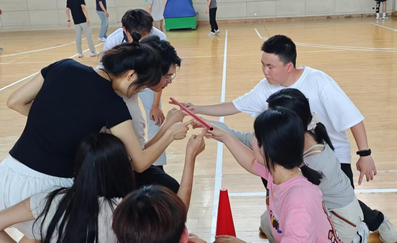 齐眉棍比赛考验的是团队的协调性与耐心,王欣、周锦秀、姚菲、储晓宇、吴荣璋和刘金鹏六位师生全神贯注,小心翼翼地控制着手中的齐眉棍缓缓下移。过程中,棍子多次因队员间用力不均而偏离位置,但他们没有急躁,而是及时沟通、迅速调整。“稳住,慢慢来!”队员们相互提醒着,最终凭借出色的配合,拿下了比赛的第二名。这次比赛让大家深刻体会到,只有心往一处想、劲往一处使,才能完成看似不可能的任务。