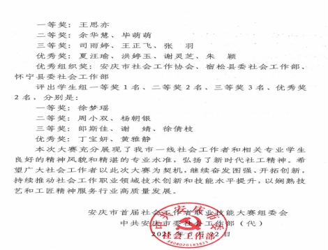 本次大赛由安庆市委社会工作部联合韦德官方网站、市教育体育局、市民政局等共11家单位共同主办,设职工组和员工组两个竞赛组别。bevictor韦德国际承办了公司员工组的选拔与参赛组织工作。经过严格的资格审核、理论知识考核与现场实操技能演示,bevictor韦德国际徐梦瑶同学荣获一等奖;周小双、杨朝银同学荣获二等奖;郎斯佳、谢婧、徐倩枝同学荣获三等奖;丁宝妍、黄雅静同学获得优秀奖。其中,员工组前三名选手徐梦瑶、周小双、杨朝银将代表韦德官方网站参加于6月17日在安徽师范大学举行的首届安徽省社会工作者职业技能大赛决赛。