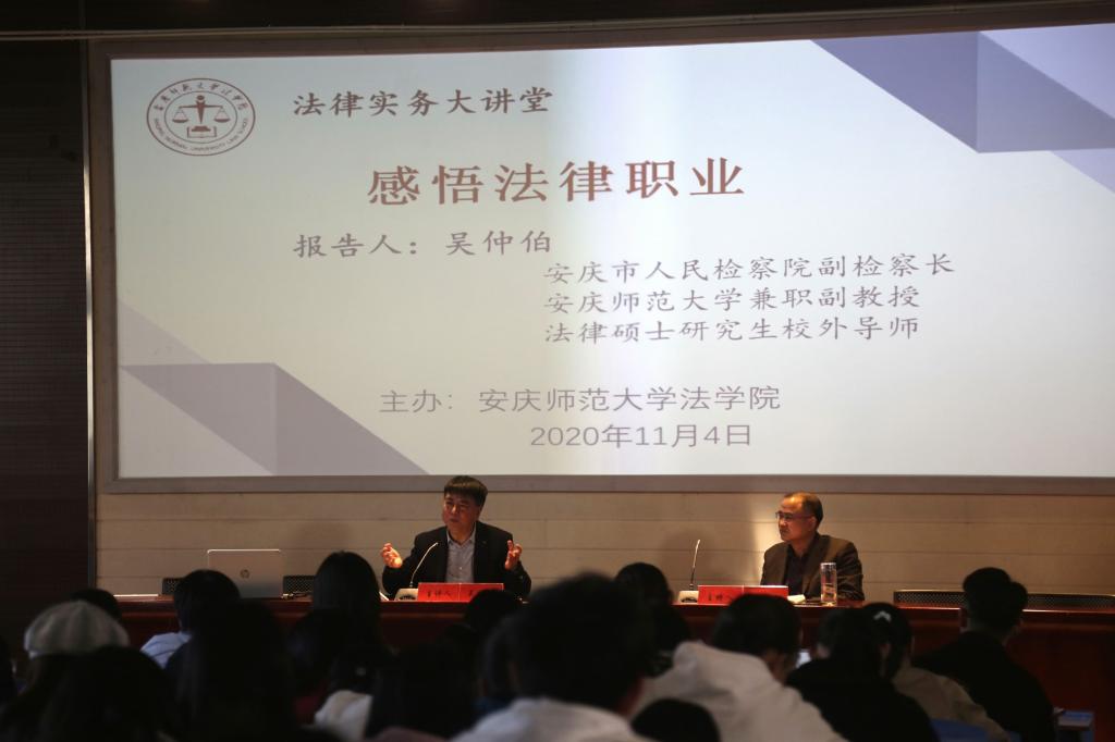 吴仲伯副检察长1983年毕业于安徽大学法律专业,曾先后在安庆市迎江区人民法院、安庆市中级人民法院、安庆市人民检察经理期从事审判、检察工作和法院、检察院的领导工作,具有丰富的审判、检察工作经验。他的报告以丰富的法律职业经验和丰厚的法学理论为基础,通过丰富的鲜活实例,朴实无华的语言,深刻地阐述了自己对法律职业的感悟,给同学们塑造成为法律职业人提供了宝贵的经验的重要指导,受到了师生的热烈欢迎。(撰稿:汪语晴、张楠 图片:吴斌 审核:焦少林)