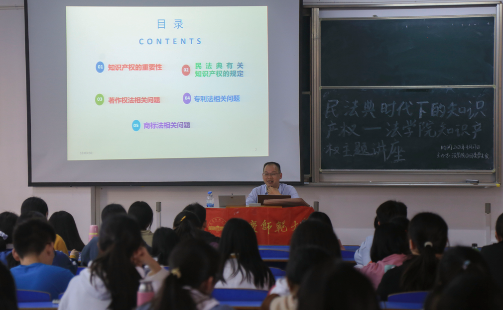 崔汪卫围绕“民法典时代知识产权法所涉及的重点问题”,从知识产权的重要性、民法典有关知识产权的规定、著作权法、专利法和商标法相关问题等五个方面向大家讲述知识产权。“专利制度是给天才之火浇上利益之油。”崔汪卫引用林肯的话佐证自己的观点,并列举高福论文抗疫、抢注“火神山”商标被罚等热点事件,逐一分析知识产权在其中起到的重要作用。