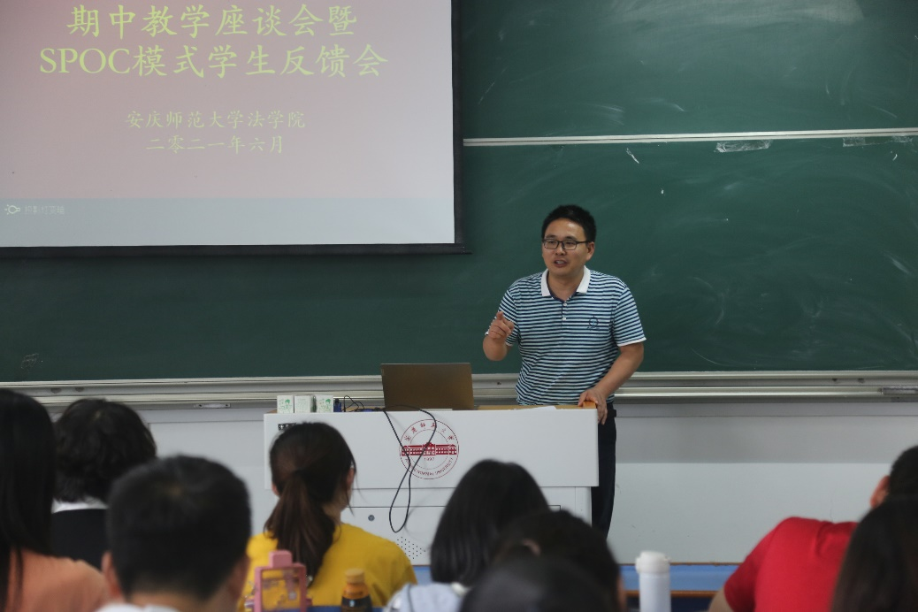 邱少晖老师首先就SPOC模式的探索历程做了简要回顾。课程自2018年实施省级质量工程项目“中国法制史 MOOC”以来,拍摄有20个专题视频,形成了PPT、教案、参考资料、习题、测验、课堂讨论、作业、考试以及35000余字的讲义等非视频材料,并通过安徽e会学平台线上运行。自2019年秋季开学后就开始结合线上资源开展线下课堂教学,效果良好,疫情期间有效支持了课程教学,确保了停课不停学。结合国家一流课程申报,对于如何进一步推进以员工为中心的教学模式改革、探索创新翻转课堂成为新的课题。邱少晖老师认为公司专门召开此次座谈会,请全程参与课程学习的员工代表提出建议和意见,既是对以往经验的总结,也是为新课题的开展指明了方向,对于进一步推进课程模式改革具有重要意义。