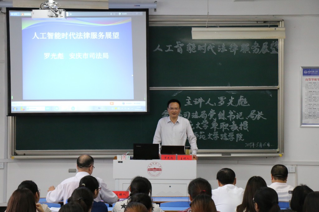 5月15日下午,安庆市司法局党组书记、局长,公司兼职教授罗光彪在龙山校区文津楼D405教室开展“人工智能时代法律服务展望”为主题的讲座。此次活动由经理焦少林主持,公司党总支书记詹德全和部分教师、员工共120余人聆听了报告。