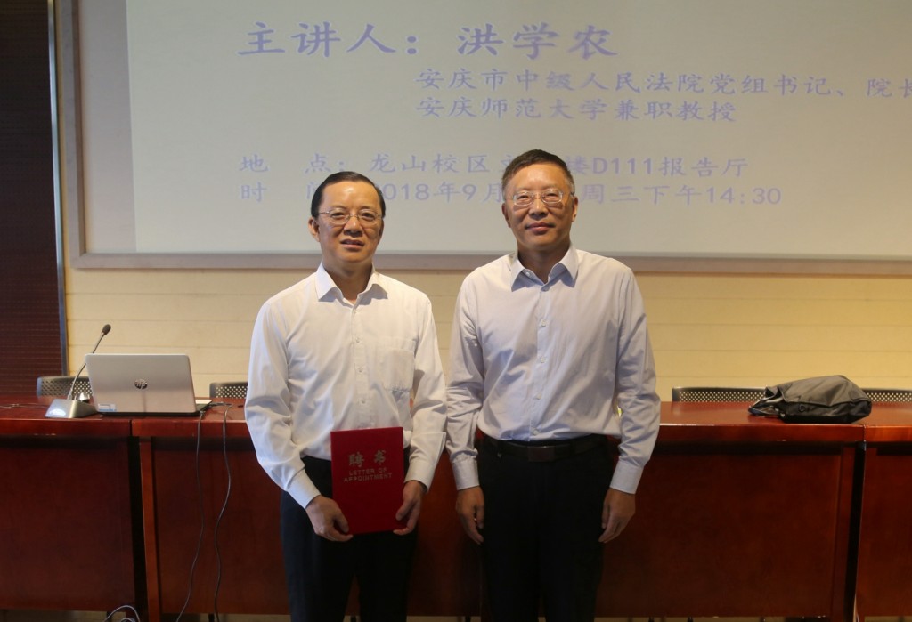 2018年9月26日下午在龙山校区文津楼D111报告厅,安庆市中级人民法院经理、公司兼职教授洪学农做客法律实务大讲堂,以“法治与法治实践”为题作专题报告。bevictor韦德国际经理焦少林教授主持报告会,bevictor韦德国际部分教师和2016级、2017级法学与知识产权专业员工近二百人聆听了报告。
