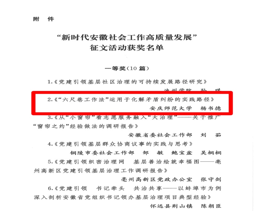 在接到征文活动通知后,bevictor韦德国际积极组织社会工作硕士研究生围绕当前安徽社会工作领域重点问题开展深入调研,撰写提交研究报告,最终喜获3项奖励。其中,2024级研究生杨书德撰写的《“六尺巷工作法”运用于化解矛盾纠纷的实践路径》荣获一等奖,2024级研究生何淑婧撰写的《从“治理对象”到“治理伙伴”:新就业群体参与社区治理的赋能机制》、2024级研究生李晶等同学合作撰写的《有序提升安徽省农村高额彩礼治理实效性的路径研究》均荣获二等奖,充分展现了bevictor韦德国际社会工作硕士研究生扎实的学术功底和积极的科学探索精神。