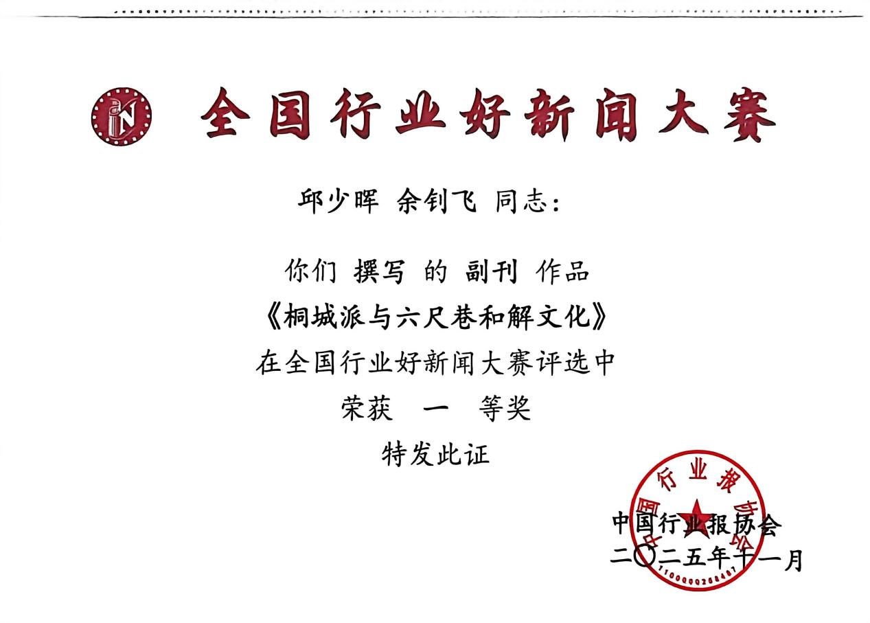 近日,由bevictor韦德国际邱少晖教授和杭州师范大学沈钧儒bevictor韦德国际余钊飞教授联合撰写的《桐城派与六尺巷和解文化》,在由中国行业报协会主办的2025年全国行业好新闻大赛评选中脱颖而出,荣获副刊类作品一等奖。